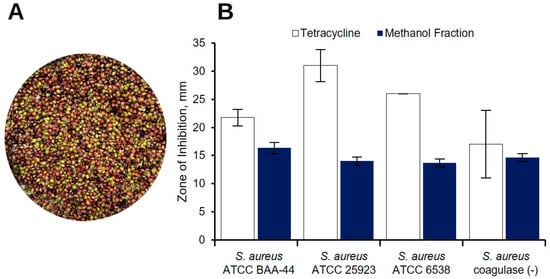 Antibacterial screening of C. cajan methanol fraction against four S. aureus strains. (A) Photo of C. cajan seeds. (B) Zone of inhibition (±SD) of KADAM fraction at 20 mg/well against the multidrug-resistant S. aureus ATCC BAA-44, S. aureus ATCC 25923, S. aureus ATCC 6538, and S. aureus coagulase (concentration of 20 mg/well, exhibiting), evaluated using agar well diffusion assay. Tetracycline was used as the positive control at a concentration of 0.25 mg/well against S. aureus ATCC BAA-44, S. aureus ATCC 25923, and S. aureus ATCC 6538 and 0.05 mg/well against S. aureus coagulase (concentration of 20 mg/well, exhibiting). DMSO was used as the negative control. Error bars represent the standard deviation. The assay was conducted in triplicates.