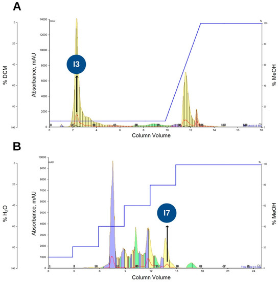 Bioassay-guided fractionation using flash column chromatography. (A) Chromatogram from the purification of KADAME fraction using normal phase chromatography. Peak annotated with black arrow as I3 in blue circle corresponds to the early eluting fraction KADAMEI3, which exhibited bioactivity against MDRSA. (B) Chromatogram from the subsequent purification of fraction KADAMEI3 using reversed phase flash column chromatography. Peak annotated with black arrow as I7 in blue circle corresponds to fraction KADAMEI3I7, which exhibited activity against MDRSA. UV λmax 254 nm (red curve) and λmax 365 nm (black curve).
