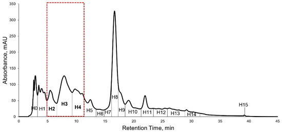 HPLC Chromatogram of KADAMEI3I7 (UV λmax 254 nm, black curve line). HPLC Fractions H2, H3, and H4 (highlighted broken line) showed antibacterial activity against MDRSA.