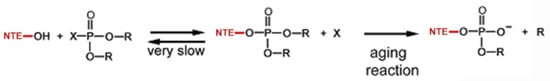Interaction of neuropathic OPs with NTE. The hydroxyl group at the active site serine reacts with the phosphorus atom of the OP, resulting in the phosphorylation of NTE and the dephosphorylated OP (X). During the aging reaction, an R group from the phosphate moiety of NTE is released, resulting in a negative charge. Due to the aging reaction not being reversible, this results in the permanent inhibition of NTE’s esterase activity.