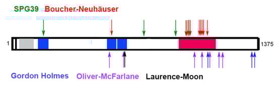 - Synofzik, M.; Gonzalez, M.A.; Lourenco, C.M.; Coutelier, M.; Haack, T.B.; Rebelo, A.; Hannequin, D.; Strom, T.M.; Prokisch, H.; Kernstock, C.; et al. PNPLA6 mutations cause Boucher-Neuhäuser and Gordon Holmes syndromes as part of a broad neurodegenerative spectrum. Brain 2014, 137, 69–77. [Google Scholar] [CrossRef]