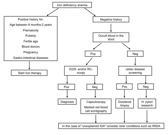 Figure 1. Diagnostic workup in case of IDA. EGD-scopy, esophagogastroduodenoscopy; RC-scopy, rectoscopy; Pos, positive; Neg, negative; H.pylori, Helicobacter pylori; IDA, iron deficiency anemia. - Among the extra-intestinal blood losses, it is worth mentioning the irregularities of the menstrual cycle, frequent in adolescents, and, rarely, secondary to Von Willebrand disease, a constitutional coagulopathy characterized by an absent to slight hemorrhagic diathesis, which may remain undiagnosed up to the menarche [11].