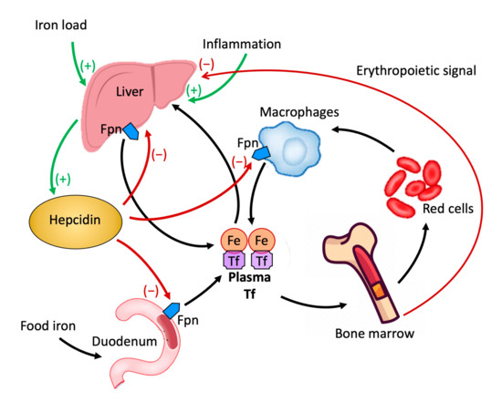 - Nemeth, E.; Ganz, T. Hepcidin-Ferroportin Interaction Controls Systemic Iron Homeostasis. Int. J. Mol. Sci. 2021, 22, 6493. [Google Scholar] [CrossRef] [PubMed]