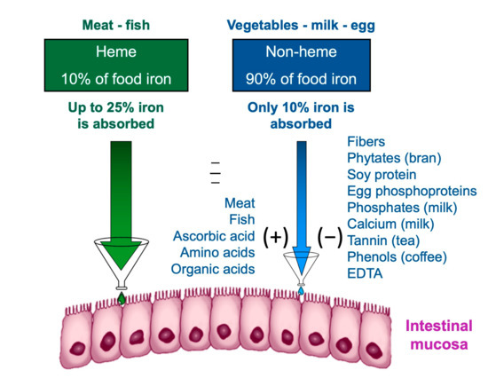The effect of the diet composition on iron homeostasis depends not only exclusively on the iron content but also on the amount that is absorbed and available. Iron is contained in food as heme and non-heme iron [58].