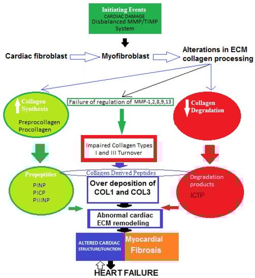A widely held concept regarding the pathogenesis of myocardial fibrosis is that cardiac lesion is considered to be an initiating event [38]. Thus, the MMP/TIMP system fails and the degradation activity of MMP-1, -2, -8, -9, and -13 is disturbed. As a result, fibroblasts in the heart are hyperactivated and transdifferentiated into myofibroblasts, which increase the production of collagen types I and III, then degradation processes decrease and abnormal collagen deposition in myocardium occurs [39,40]. Therefore, impaired collagen turnover abnormally affects the remodeling of cardiac ECM, and COL1-/COL3-derived peptides are released into the circulation. This can trigger an incessant vicious cycle of COL1/COL3 over-deposition and consequent suppressed degradation.All of these processes might contribute tothe development of cardiac fibrosis in heart failure. However, the molecular mechanisms of the genesis and progression of myocardial fibrosis are not yet fully clear (Figure 2) [39,40,41,42,43,44,45].