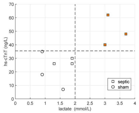 Values of hs-cTnT and lactate at the end of the experiment for all the animals (n = 9). Squares refer to septic pigs, whereas circles to sham animals. The black lines mark the levels of hs-cTnT = 35 ng/L and lactate = 2 mmol/L. The orange squares represent the high hs-cTnT group.