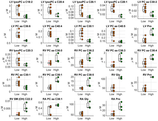 We compared the metabolites concentration in heart tissues between the two groups, i.e., high vs. low hs-cTnT (Figure 2, Table S4). There was a significant difference in left ventricle, right ventricle, and right atria for some PC species. Interestingly, proline was found to be significantly higher in the high cTnT group in all heart tissues, whereas glycine was significantly higher in RA and RV tissues.