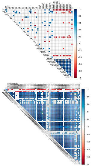 We investigated the correlation between the fold-change in hs-cTnT concentration in peripheral blood with the fold-change in both cytokines and metabolite concentrations in all animals (n = 9). Figure 3 and Figure S1 illustrate the significant correlations for Res./BL and SS/BL fold-change, respectively. Most of the fold-changes between the metabolites level measured at baseline and after full resuscitation (Res./BL) are correlated with the fold-change in hs-cTnT (Figure 3). In particular, the fold-change of hs-cTnT was positively correlated with cytokines, creatinine, trans-4-hydroxyproline (t4-OH-Pro), and proline (Pro) and negatively correlated with sphingomyelins (SM), the most abundant lysophosphatidylcholine species (lyso PC 16 and lyso PC 18), and most diacylphosphatidylcholine species (PC). In addition, the fold-change of both cytokines was positively correlated with proline fold-change. The high level of correlation observed among the species of SM, PC, and lysoPCs and hs-cTnT values suggests they likely carry similar information.