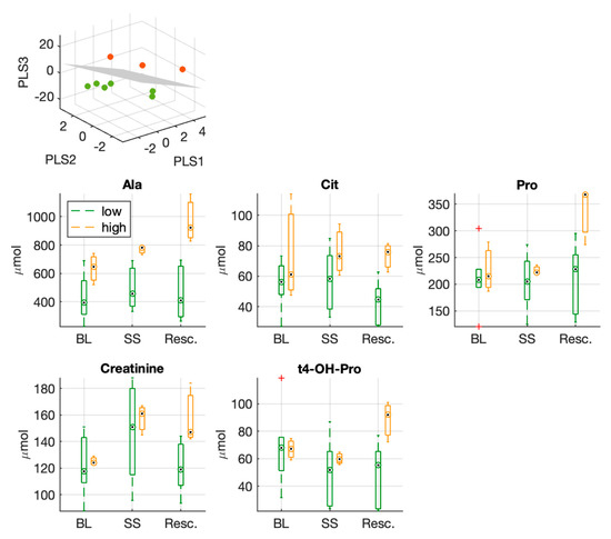 Three-dimensional PLS-DA score plots from the model built with the fold changes (Res./BL) of circulating metabolites used to separate the two experimental groups (low vs. high hs-cTnT group). Below, boxplots of metabolites which resulted significantly different at the end of the experiment (after full resuscitation) between the two groups; proline, creatinine and hydroxyproline were listed among the first ranked features in the PLS-DA VIP score.