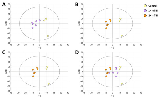Finally, to test for the existence of a progressive trend in the data following the 1× mTBI and 2× mTBI interventions, the 1× mTBI data were predictively projected onto the existing OPLS-DA model for sham control vs. 2× mTBI. This resulted in the 1× mTBI data projecting into the model space between the sham control and 2× TBI groups, indicating a progressive change in the lipid data: sham control → 1× mTBI → 2× mTBI (Figure 1D).