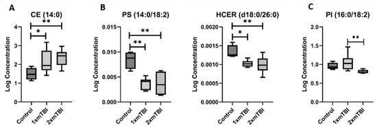 Lipids that change with one and two injuries vs. sham control. (A), increase after 1× or 2× mTBI; (B), decrease after 1× or 2× mTBI; (C), increase with 1× mTBI and decrease with 2× mTBI. Boxplots represent the minimum, first quartile, median, third quartile, and maximum, for the control, 1× mTBI and 2× mTBI groups. Significant differences between groups are indicated above the boxplots by * (p < 0.05) or ** (p < 0.01). CE, cholesterol ester; HCER, hexosylceramide; mTBI, mild traumatic brain injury; PI, phosphoinositol; PS, phosphoserine.