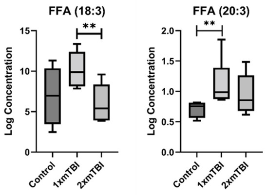 Lipids that change with one injury vs. sham control. Boxplots represent the minimum, first quartile, median, third quartile, and maximum, for the control, 1× mTBI and 2× mTBI groups. Significant differences between groups are indicated above the boxplots by ** (p < 0.05) or ** (p < 0.01). FFA, free fatty acid; mTBI, mild traumatic brain injury.