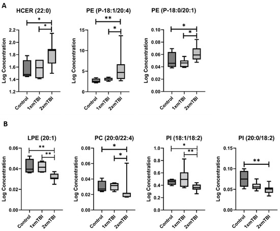 Lipids that change with two injuries vs. sham control. (A), Increase after 2× mTBI; (B), decrease after 2× mTBI. Boxplots represent the minimum, first quartile, median, third quartile, and maximum, for the control, 1× mTBI and 2× mTBI groups. Significant differences between groups are indicated above the boxplots by * (p < 0.05) or ** (p < 0.01). HCER, hexosylceramide; LPE, lysophosphatidylethanolamine; mTBI, mild traumatic brain injury; PC, phosphocholine; PE, phosphoethanolamine; PI, phosphoinositol.