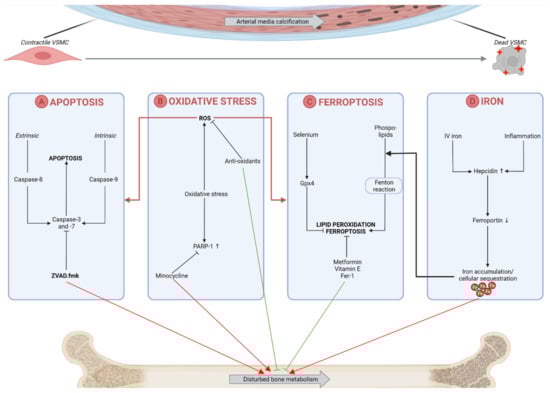 Targeting vascular smooth muscle cell (VSMC) death and oxidative stress-related processes as a possible way to tackle arterial media calcification and its effect on bone mineralization. (A) Apoptosis, a caspase-dependent type of cell death, contributes to the development of arterial media calcification. Apoptotic bodies act as a nucleation site for the deposition of calcium-phosphate crystals. The caspase inhibitor ZVAD.fmk has shown its efficiency in inhibiting arterial calcification but may cause detrimental effects on bone metabolism as caspases play an important role in physiological bone mineralization as well. (B) Oxidative stress, a central process in the onset of arterial calcification, either results in the generation of reactive oxygen species (ROS) which in turn drives the onset of apoptosis and ferroptosis, or the upregulation of poly(ADP-ribose) polymerase-1 (PARP-1) which stimulates the osteogenic transdifferentiation of VSMCs. Antioxidants and PARP inhibitors (i.e., minocycline) encounter arterial calcification but respectively enhance or disturb physiological bone mineralization. (C) A possible role of lipid peroxidation and ferroptosis (i.e., an iron-mediated type of regulated cell death) in arterial media calcification. Both mechanisms might be targeted without causing side-effects on the bone metabolism as metformin, vitamin E and ferrostatin-1 (Fer-1), which are therapeutics shown to inhibit ferroptotic events, show stimulatory effects on bone formation. Furthermore, selenium administration is known to inhibit VSMC calcification but also is an important co-factor of glutathione peroxidase 4 (Gpx4), an important regulator in ferroptosis. (D) The intravenous (IV) injections of iron to CKD patients on dialysis and inflammatory states cause a hepcidin upregulation, which in turn downgrades ferroportin (i.e., an important iron exporter) and causes intracellular iron sequestration. On one hand, this can induce lipid peroxidation and ferroptosis, and on the other hand, iron overload is known to favor a disturbed bone metabolism. Upward arrow indicates upregulation while downward arrow indicates downregulation.