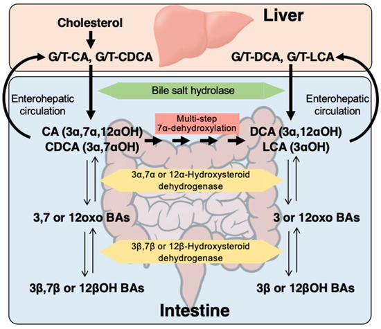 Metabolism of primary bile acids (BAs) conjugated with amino acid (glycine or taurine). Microbial bile salt hydrolase deconjugates the amino acid to form free cholic acid (CA) and chenodeoxycholic acid (CDCA). The free (deconjugated) CA and CDCA are then metabolized to deoxycholic acid (DCA) and lithocholic acid (LCA), respectively by multi-step 7α-dehydroxylation. Hydroxyl groups at the 3α, 7α, and 12α positions can be converted to carbonyl groups by 3α-, 7α-, and 12α-hydroxysteroid dehydrogenases, respectively. In addition, the carbonyl groups at the 3, 7, and 12 positions can be converted to hydroxyl groups at the 3β, 7β, and 12β positions by the reverse reactions of 3β-, 7β-, and 12β-hydroxysteroid dehydrogenases, respectively. G/T-, glycine or taurine conjugated.