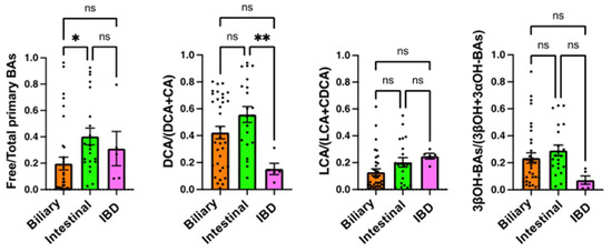 Comparison of serum BA markers among patients with different underlying diseases. Serum samples were obtained on admission (prior to antibiotic use and CDI onset). Biliary, patients with hepato-biliary-pancreatic diseases (n = 34); Intestinal, patients with gastrointestinal diseases (n = 21); IBD, patients with inflammatory bowel diseases (n = 5). Each column and error bar represents the mean and SEM. According to the Tukey–Kramer test, * p < 0.05 and ** p < 0.01 were significantly different; ns, not significant.