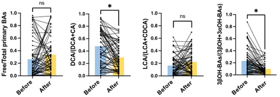 In addition to DCA/(DCA + CA), we also calculated LCA/(LCA + CDCA), 3βOH-BAs/(3βOH + 3αOH-BAs), and free/total primary BAs in this study. LCA/(LCA + CDCA) should also reflect the 7α-dehydroxylating activity of the intestinal bacteria but showed different results from DCA/(DCA + CA) (Figure 2, Figure 3 and Figure 4). In healthy subjects, the LCA/(LCA + CDCA) ratios were much smaller than the DCA/(DCA + CA) ratios in serum but not in feces [18], which suggests that LCA is less readily absorbed from the intestine than other BAs. Therefore, DCA/(DCA + CA) is a better serum marker for 7α-dehydroxylation than LCA/(LCA + CDCA). Serum 3βOH-BAs/(3βOH + 3αOH-BAs) represents epimerization activity from 3αOH to 3βOH. In our previous study [18], this ratio was also positively correlated with the fecal fraction of Clostridium subcluster XIVa. Although it is not clear if this bacterial subcluster epimerizes the hydroxyl group at the C-3 position, the change in 3βOH-BAs/(3βOH + 3αOH-BAs) was associated with the change in DCA/(DCA + CA) (Figure 2, Figure 3 and Figure 4). On the other hand, free/total primary BAs may be a surrogate marker for small intestinal bacterial overgrowth (SIBO). In bile, almost all BAs are conjugated with amino acid and deconjugated by bile salt hydrolases of various genera in the gut microbiota, including Bacteroides, Bifidobacterium, Clostridium, Enterococcus, and Lactobacillus [19]. Since nearly 95% of BAs are reabsorbed from the small intestine [14], and most primary BAs originate from the small rather than the large intestine, patients with SIBO may have an increased serum deconjugated (free) primary BA fraction.