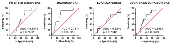 We calculated the sensitivity and specificity of each BA marker to predict CDI development using 71 patients by ROC analyses (Figure 6). The areas under the curve (AUC) and the 95% confidence intervals of free/total primary BAs, DCA/(DCA + CA), LCA/(LCA + CDCA), and 3βOH-BAs/(3βOH + 3αOH-BAs) ratios were 0.6045 (0.4648–0.7443) (NS), 0.7571 (0.6217–0.8924) (p < 0.01), 0.5240 (0.3333–0.7147) (NS), and 0.6681 (0.5248–0.8113) (p = 0.068), respectively. Since DCA/(DCA + CA) had the largest AUC, this ratio appears to be the optimal biomarker for the prediction of CDI. The cut-off value of DCA/(DCA + CA) was <0.349 for discriminating the high-risk patients with CDI on admission (prior to antibiotic use and CDI onset). At this value, the sensitivity was 91.67%, the specificity was 66.10%, and the likelihood ratio was 2.704.