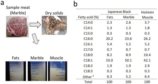 In contrast, Muscle (52.7%) contained more evaporated water than Fats (14.1%) and Marble (31.2%) in Table 1. The table in Figure 1b shows the fatty acid composition of each beef tallow sample. The prepared beef tallow primarily consisted of lipids, and the fatty acid composition of the total lipid included oleic acid (C18:1), palmitic acid (C16:0), and stearic acid (C18:0). Oleic acid content was higher in the Fats and Marble of the Japanese Black cattle, whereas palmitic acid, stearic acid, and linoleic acid (C18:2) content was higher in the Holstein muscle tissue.