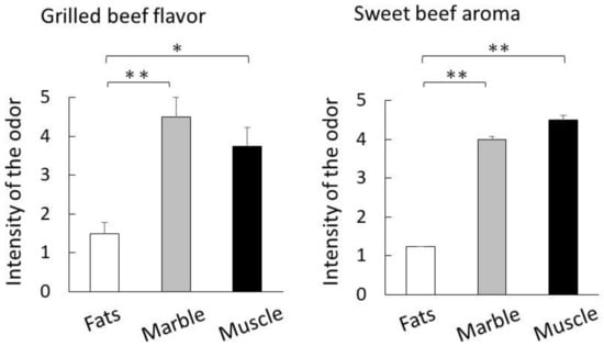 Aroma characteristics of prepared beef tallow by sensory evaluation. The bar graph shows the intensity of the beef tallow aroma after cooking (mean, four panelists). Significant differences are shown as follows. ** p < 0.01, * p < 0.05 (Tukey’s test; Fats vs. Marble vs. Muscle).