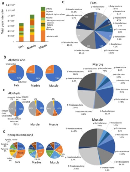 Analysis of aroma components generated from beef tallow by dynamic headspace–gas chromatography–mass spectroscopy. (a) Composition of the main functional groups of odorants in beef tallow. The bar graph shows the total intensity the summed intensities of detected compound peaks as classified by functional group. (b–e) Composition of lactone produced from beef tallow extracted from intermuscular fat of Japanese Black cattle. The pie chart shows the lactones produced by Fats, Marble, and Muscle. All graphs show the mean of the values obtained from three analyses.