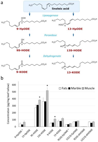 Quantitation of oxidative metabolites of linoleic acid. (a) Schematic diagram of lipid oxidation of linoleic acid. (b) Composition of oxidized linoleic acid in beef tallow. The graph shows the mean values obtained from three analyses of independently prepared samples. Data represent the mean ± standard error (n = 3). Significant differences are shown as follows. * p < 0.05 (Tukey’s test; Fats vs. Marble vs. Muscle). a indicates compounds below the lower limit of quantitation.