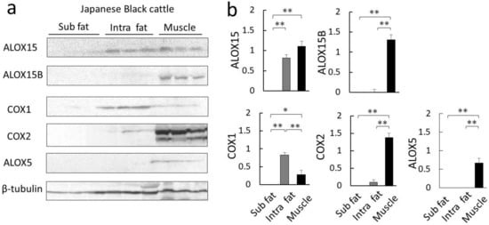 Comparison of lipid oxidase expression in Japanese Black cattle. (a) Western blot analysis using specific antibodies against lipoxygenase or cyclooxygenase was used to detect protein levels in subcutaneous fat (Sub fat), intramuscular fat (Int fat), and muscle tissue. The samples consisted of total proteins prepared from the sternocleidomastoid muscle of Japanese Black cattle. Samples prepared from three different cattle were analyzed. (b) The graph shows the mean of the intensity values detected by Western blot analysis. The data represent the mean ± standard error (n = 3). Significant differences are shown as follows: * p < 0.05 and ** p < 0.01 (Tukey’s test; Sub fat vs. Int fat vs. muscle tissue for each protein). Abbreviations: arachidonic acid 15-lipoxygenase (ALOX15), its isozyme ALOX15B, 5-lipoxygenase (ALOX5), cyclooxygenases 1 (COX1), and its isozyme COX2.