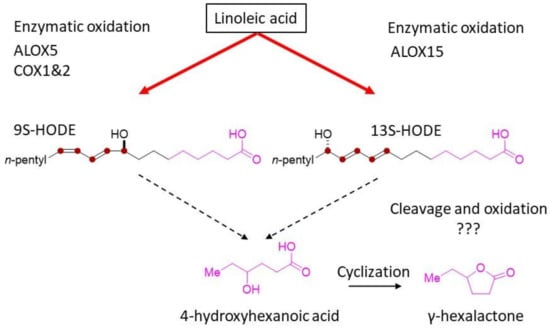 Proposed pathway of γ-hexalactone related to the sweet aroma of beef via enzymatic reaction. We propose a pathway for the formation of γ-hexalactones via intermediates 9S-HODE or 13S-HODE, which are produced from free linoleic acid in beef by enzymatic oxidation. These hydroxy fatty acids may be further degraded to 4-hydroxyhexanoic acid through cleavage and oxidation reactions, and then to γ-hexalactone by cyclization reactions. Question marks (???) indicates an unknown chemical reaction pathway.