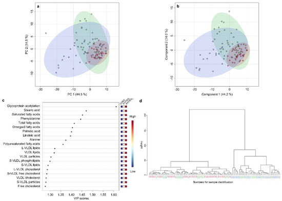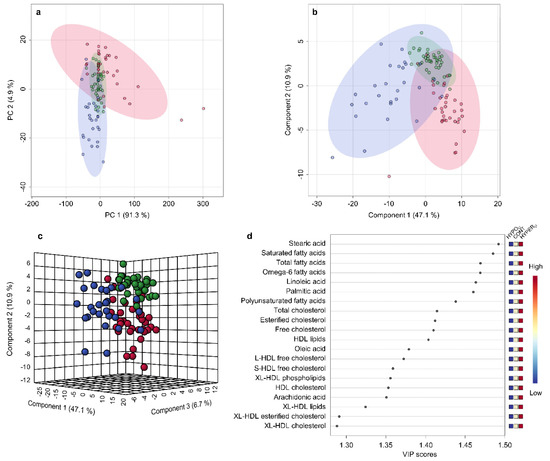 In both, PCA and PLS-DA scores plots, the broad clusters of the HYPERU group mostly entirely overlapped the clusters of the CONT group and the HYPERT group clusters did so as well. However, even though clusters of the HYPERU and HYPERT groups were partly overlapping, they trended into different directions (Figure 5a,b). Total variance explained by PC 1 and 2 of the PCA model added up to 59.3%, very similar to the total variance contributed by the first two PLS-DA components, which added up to 58.2% (Figure 5a,b). According to the PCA loading plots, the separation of HYPERU and HYPERT groups is mostly due to elevated absolute fatty acid and lipid concentrations in the HYPERU group, while in the HYPERT groups relative concentrations of saturated fatty acids were increased, in addition to other parameters (Supplementary Figure S2b).