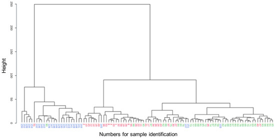 Dendrogram of hierarchical cluster analysis of serum metabolomics data from canine samples of either hyperadrenocorticism untreated (HYPERU, blue, n = 27), hypoadrenocorticism untreated (HYPOU, red, n = 35), and control (CONT, green, n = 40) groups. Each number on the x-axis reflects one serum sample. The y-axis shows the similarity levels expressed as Euclidean distances. Horizontal and vertical lines depict clustering of samples and differences in the distances, respectively.