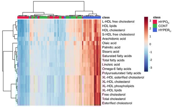 A hierarchical cluster heat map of the top 20 parameters from PLS-DA VIP scores of the first component largely revealed higher serum metabolite concentrations in the HYPERU group and lower metabolite concentrations in the HYPOU group. The hierarchical cluster analysis of the heatmap assigned the samples from HYPERU and HYPOU groups into two clusters with some exceptions. The samples from the CONT group did not form a separate cluster but were rather distributed among those two clusters. Despite being split by some CONT samples, two subclusters mainly consisting of HYPOU samples showed similarity based on color intensity patterns (Figure 3).