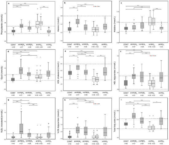 Concentrations (mmol/L) of phenylalanine (a), alanine (b), histidine (c), glycoprotein acetyls (GlycA) (d), high-density lipoproteins (HDL) cholesterol (e), HDL triglycerides (f), very-low-density lipoproteins (VLDL) cholesterol (g), VLDL triglycerides (h), and total fatty acids (i) in samples from dogs in the groups of CONT, HYPERU, HYPERT, HYPOU, and HYPOT. The boxes of the HYPOU group are presented both from the unpaired group utilized in multivariate analyses (n = 35, left) and the paired group (n = 23, right) utilized in comparison of HYPOU and HYPOT groups. Boxes indicate the lower to upper quartile (25th–75th percentile) and median value. Whiskers extend to minimum and maximum values. Outliers are shown as individual open circles or stars. Dashed lines indicate reference intervals. Lines above figures reflect significant differences between specific groups (* p < 0.05; ** p < 0.01; *** p < 0.001). Note: CONT—control group; HYPOU—hypoadrenocorticism untreated; HYPOT—hypoadrenocorticism treated; HYPERU—hyperadrenocorticism untreated; HYPERT—hyperadrenocorticism treated.