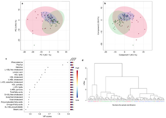 In the PCA, considerable overlap of HYPOU, HYPOT, and CONT group clusters was observed (PC 1 = 42.1%, and PC 2 = 18.5% of total variance). Approximately half of the HYPOT samples overlapped with the CONT group cluster, while the others spread to the left or/and downwards, causing a large HYPOT cluster (Figure 6a). This shift is mainly due to the contribution of fatty acid, lipid, and lipoprotein concentrations, as shown in the PCA loadings plot (Supplementary Figure S2c). A similar clustering was seen in the PLS-DA scores plot (Figure 6b). In addition to phenylalanine and histidine, within the top 20 parameters identified by PLS-DA VIP scores of the first component, fatty acids, cholesterol subtypes, and HDL fractions were most relevant for separation (Figure 6c).