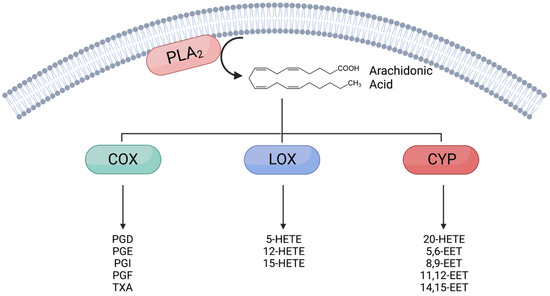Eicosanoids derived from arachidonic acid (AA). Phospholipids containing AA are hydrolyzed by phospholipase A2 (PLA2), releasing free AA. AA can be subsequently metabolized by three enzymes and their associated pathways, cyclooxygenase (COX), lipoxygenase (LOX and cytochrome P450 (CYP)). These enzymes mediate the production of the eicosanoids, biologically active metabolites of AA including prostaglandins (PGs), thromboxane (TXA), hydroxyeicosatetraenoic acids (HETEs), and epoxyeicosatrienoic acids (EETs).