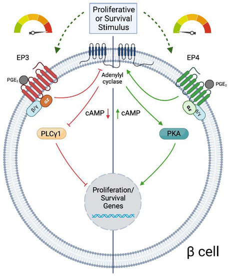 - Carboneau, B.A.; Allan, J.A.; Townsend, S.E.; Kimple, M.E.; Breyer, R.M.; Gannon, M. Opposing effects of prostaglandin E2 receptors EP3 and EP4 on mouse and human β-cell survival and proliferation. Mol. Metab. 2017, 6, 548–559. [Google Scholar] [CrossRef]