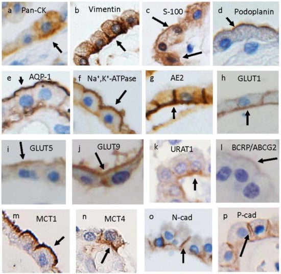 CPE cells are characterized by positive immunoreactivities for cytokeratin, vimentin, S-100 protein, and podoplanin [,,] (Figure 2a–d). CPE cells are equipped with several transporters for glucose-related substances as well as for CSF secretion in the apical and/or basolateral cytoplasmic membrane (Figure 2e–n). The well-known transporters in apical and basolateral cytoplasmic membranes, such as aquaporin 1 (AQP1), Na+, K+, ATPase, and anion exchange protein 2 (AE2), are shown in Figure 2e-g. In addition, transporters for glucose (Figure 2h), fructose (Figure 2i), urate (Figure 2j–l), and lactate (Figure 2m,n) are shown in Figure 2. It is also known that tight junctions between epithelial cells are mainly composed of occludins and claudins. N-cadherin (Figure 2o) and P-cadherin (Figure 2p) have been reported to be expressed in the lateral membrane and basal labyrinth of CPE cells [,], whereas it remains controversial whether the typical epithelial cadherin, E-cadherin, is expressed in the CPE cells of mammalian brains [,]. Claudin-1, -2, -3, and -11 are expressed in the tight junctions of CPE cells [,]. Interestingly, claudin-2 allows the unique transport permeation of monovalent cations, as well as H2O [], and may contribute to the transepithelial resistance of CP.