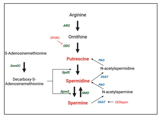 Polyamine metabolism is tightly regulated by the activities of ODC, SamDC, and SSAT, enzymes that are controlled through differing mechanisms. ODC activity is increased in response to growth factors, changes in the abundance of amino acids, and hypotonic stress [63,64,65]. ODC production is regulated at the transcriptional as well as the translational level. The post-translational control of ODC occurs by the induction of ornithine decarboxylase antizyme (OAZ). Accumulation of polyamines triggers OAZ, which complexes with ODC to alter its conformation, resulting in its enzymatic inhibition and acceleration of its catabolism [66]. High concentrations of polyamines also negatively regulate SamDC levels at both transcriptional and translational levels [67]. Finally, SSAT is induced by the increase in the intracellular polyamine content [68], promotes the release of polyamines in the acetylated form, and enhances putrescine oxidation by DAO [69]. Polyamines can be also be transported across the membrane by polyamine transporters [70,71]. Whereas polyamine transporters are well characterized in lower organisms, more studies in mammalian cells are warranted.