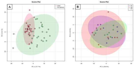 Principal component analysis (PCA) scores plot of metabolome distribution of plasma of dams between the times ((A) initial and pre-delivery) and between the nutritional treatments in pre-delivery period ((B) NP, PP and FP).