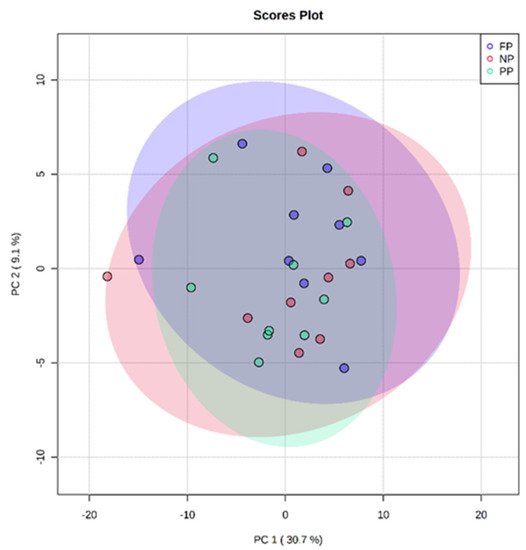 Principal component analysis (PCA) scores plot of metabolome distribution of plasma of offspring between the prenatal nutritional treatments at 30 days of age (NP, PP, and FP).