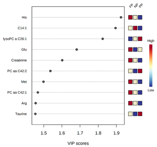 Top 10 metabolites (VIP scores) of calves at 30 days of age associated to the different prenatal treatments (NP, PP, and FP).