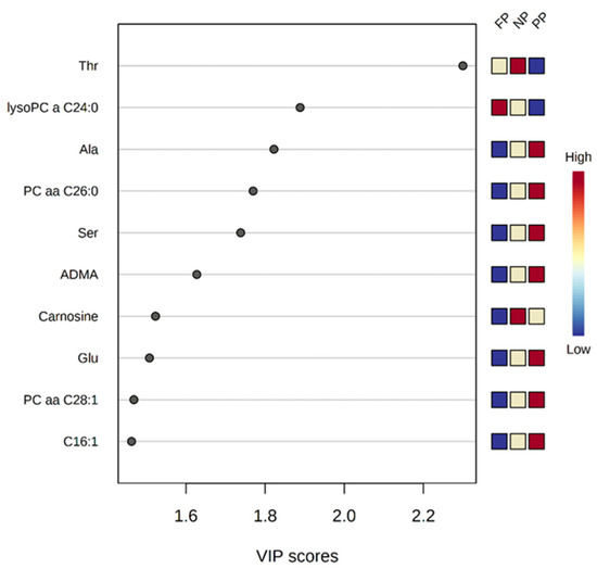 Top 10 metabolites (VIP scores) of dams in the pre-delivery stage associated to the different prenatal treatments (NP, PP and FP).