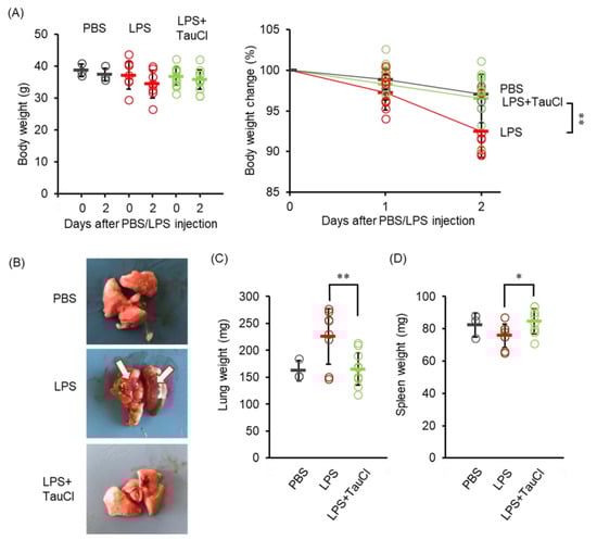 Effect of TauCl on lung inflammation induced by intratracheal LPS. (A) The changes in body weight after intratracheal PBS or LPS injection with TauCl. Body weight was monitored after LPS injection. (B) Representative lung images isolated from mice at 2 days after LPS injection. White arrows indicate the inflammation site. (C,D) The weight of lungs (C) and spleens (D) was shown. TauCl was intraperitoneally pretreated 1 h prior to LPS injection in the TauCl-treated group (LPS + TauCl). Values shown represent means ± SD. n = 3 (PBS), 9 (LPS), and 11 (LPS + TauCl). * p < 0.05, ** p < 0.01 (Tukey-Kramer’s t-test).