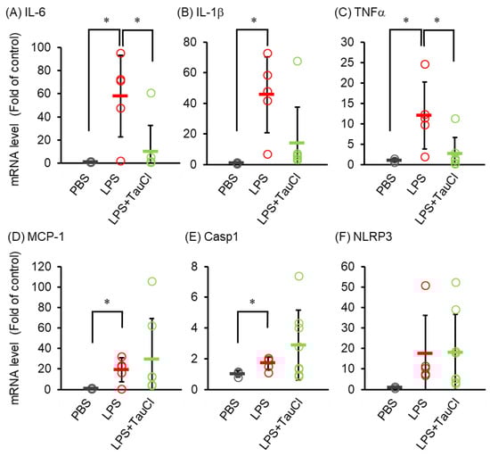 Effect of TauCl on LPS-induced expression of cytokine/chemokine mRNA in the lung. The lungs were isolated from mice 2 days after PBS or LPS injection. TauCl was intraperitoneally pretreated 1 h prior to LPS injection (LPS + TauCl). The expression of IL-6 (A), IL-1β (B), TNFα (C), MCP-1 (D), Casp1 (E) and NLRP3 (F) were measured by qPCR. The expression level was normalized by the expression level of GAPDH. Values are shown fold of control (PBS). n = 3 (PBS), 8 (LPS), and 11 (LPS + TauCl). * p < 0.05 (Tukey–Kramer’s t-test for IL-6, IL-1β, MCP-1, Casp1 and Mann-Whitney U-test for TNFα).