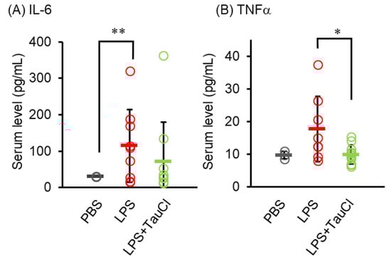 Effect of TauCl and taurine on serum cytokine level. Blood was collected from mice 2 days after PBS or LPS injection. Serum IL-6 (A) and TNF-α (B) levels were measured by ELISA. Values shown represent means ± SD. n = 3 (PBS), 8 (LPS), and 11 (LPS + TauCl). * p < 0.05, ** p < 0.01 (Tukey–Kramer’s t-test).