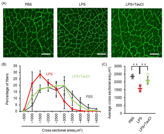 Effect of TauCl on skeletal muscle wasting induced by intratracheal LPS. The skeletal muscles (tibialis anterior muscles) were isolated from mice 2 days after PBS or LPS injection. TauCl was intraperitoneally pretreated 1 h prior to LPS injection (LPS + TauCl). Frozen section of skeletal muscles were immunostained with anti-laminin antibody. (A) Representative cross sectional image of skeletal muscle. Scale bars indicate 100 μm. (B) Cross sectional area of skeletal muscle fiber was measured from the immunostained images. Values indicate the frequency (percentage) of each size of muscle fiber. (C) The average of cross sectional area of skeletal muscle of each mouse was shown. n = 3 (PBS), 5 (LPS), and 5 (LPS + TauCl). ** p < 0.01 (Tukey–Kramer’s t-test).