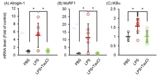 Effect of TauCl on the atrogenes and IKBa expression in skeletal muscle in LPS-treated mice. The tibialis anterior muscles were isolated from mice 2 days after PBS or LPS injection. TauCl was intraperitoneally pretreated 1 h prior to LPS injection (LPS + TauCl). The expression of Atrogin-1 (A), MurF1 (B) and IkBα (C) were measured by qPCR. The expression level was normalized by the expression level of GAPDH. Values are shown fold of control (PBS). n = 3 (PBS), 7 (LPS), and 7 (LPS + TauCl). * p < 0.05 (Tukey–Kramer’s t-test).