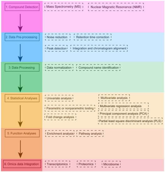 Typical workflow of metabolomics analysis. Metabolites are detected by using specific detection techniques (compound detection). Raw signals are then pre-processed to produce data in a suitable format for subsequent statistical analysis (data pre-processing). Then, data normalization is used to reduce the system and technical bias. For untargeted studies, metabolites are identified from spectral information in some given database (data processing). Univariate and multivariate statistical analyses are used to identify significantly expressed metabolites (statistical analyses). Next, the significantly expressed metabolites are subsequently linked to the biological context by using enrichment and pathway analysis (function analyses). Finally, metabolomics data may be integrated with other omics data (transcriptomics, proteomics, or the microbiome) to gain a comprehensive understanding of the molecular mechanisms of pathophysiological processes (Omics data Integration).