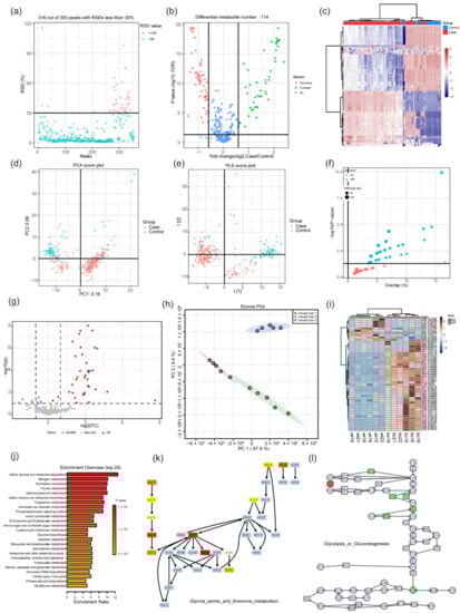 Some graphical visualization features of MetFlow and MetaboAnalyst 5.0. (a) RSD (relative standard deviation) plot in the data processing function of MetFlow. Features with a high percent RSD should be removed from the subsequent analysis (the suggested threshold is 20% for LC-MS and 30% for GC-MS). (b) Volcano plot and (c) heatmap of the differential metabolites in the statistical analysis function of MetFlow, the thresholds can be set autonomously by the submitter. (d) PCA analysis and (e) PLS analysis in MetFlow. (f) Pathway enrichment overview in MetFlow, each circle represents a different pathway. Circle size and color are based on the pathway size and p-value. (g) Volcano plot of the differential analysis in MetaboAnalyst 5.0. (h) PCA analysis plot in MetaboAnalyst 5.0. (i) Heatmap shows the differential metabolites in the statistical analysis function of MetaboAnalyst 5.0. (j) Pathway enrichment overview in MetaboAnalyst 5.0. Color shade is based on the p-value. (k) The demo-enriched metabolism pathway in MetaboAnalyst 5.0. Light blue indicates that it is not an uploaded metabolite, but instead was used as background for enrichment analysis. Red indicates the metabolite is in the uploaded data and represents the different level. (l) An example of joint pathway analysis in MetaboAnalyst 5.0. By uploading candidate genes and metabolites, the corresponding pathway view is generated. Squares represent genes and circles represent metabolites. Red and green indicate the different levels. All images were obtained using the example data provided by the software.