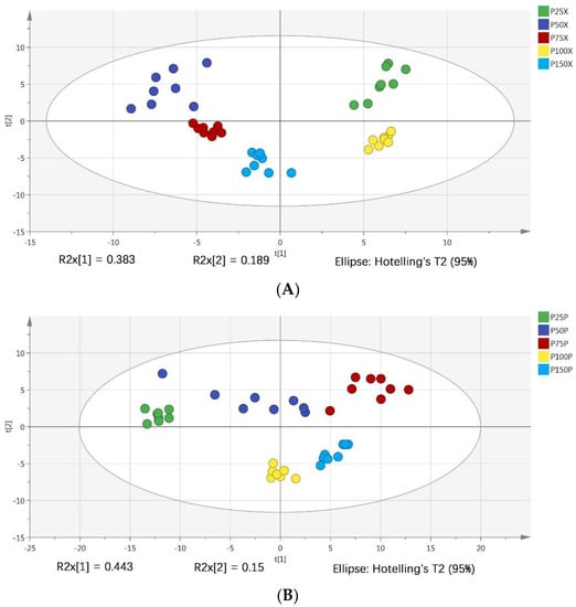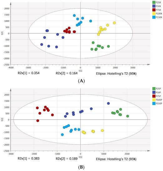 PLS-DA is a discriminant analysis method based on the classical partial least squares regression model. By properly rotating the principal components, PLS-DA can effectively distinguish the observed values between groups and find the influencing variables that lead to the difference between groups []. PLS-DA analysis was further used to verify the constructed PCA model. PLS-DA scores of cucumber xylem and phloem sap samples under five phosphorus levels were shown in Figure 2A,B. The results were similar to PCA. The cumulative discriminant interpretation ability of cucumber xylem sap of the model under positive ion mode was R2X = 0.849, R2Y = 0.97, and the prediction ability of the model was Q2 = 0.924, the cumulative discrimination and interpretation ability of cucumber phloem sap of the model under positive ion mode was R2X = 0.92, R2Y = 0.962, and the prediction ability of the model was Q2 = 0.806. The closer these three indexes are to 1, the more stable and reliable the model is, and the fitting degree of the model is better. At the same time, the randomly repeated tests of n = 200 was adopted. As shown in Figure 2C,D, the R2 and Q2 values of the model of cucumber xylem and phloem sap on the far right exceeded 0.9, and the intercept of Q2 regression line was −0.943 and −1.09 respectively, which were both less than 0.05, indicating that the randomly repeated test was qualified, the model did not have over fitting phenomenon, and had good stability and predictability, it was suitable to explore the metabolite differences of cucumber xylem and phloem sap under different phosphorus levels.