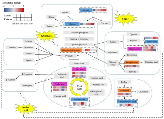 Through metabolic pathway analysis, the differential metabolites were mapped, which reflected there were extremely significant differential metabolites in xylem and phloem []. Among them, there were six species in xylem, including glutamate, phenylalanine, phosphoenolpyruvate, ethanolamine, malic acid and citric acid, and eight species in phloem, including γ-aminobutyric acid, homoserine, succinic acid, glucose, sucrose, ethanolamine, malic acid and citric acid. In order to understand the key metabolites more intuitively, the metabolic pathway network change diagram shown in Figure 5 was obtained, and the average value of the extremely significant differential metabolites content under the same phosphorus stress level in the thermodynamic diagram was extracted to make a small hot box []. Similarly, the color of the small hot box indicated the content of extremely significant differential metabolites in the group of samples, and the color from blue to white to red represented the gradual increase of the relative content of extremely significant differential metabolites.